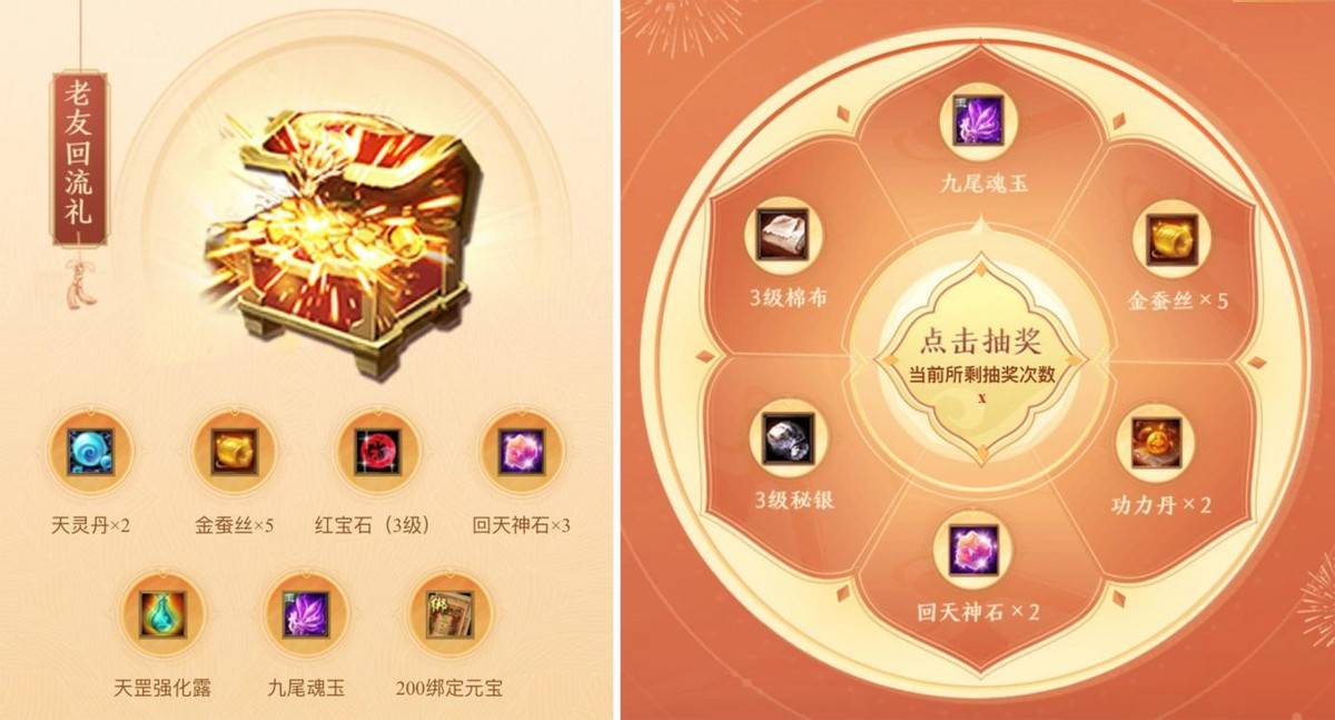 还有这次的老玩家的回流福利更更更夸张,回流礼直接就能领7个奖励,达成活跃能再抽奖,轮盘上基本都是好东西,100%中奖,这谁能不迷糊?