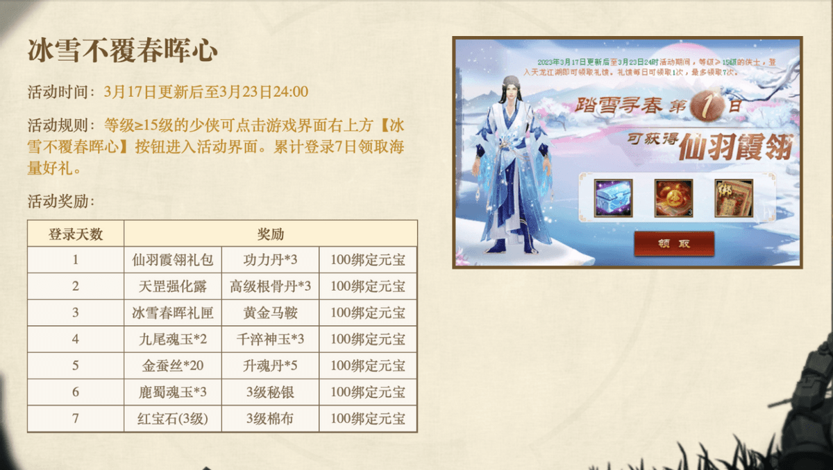 就比如说新活动“黄金逆袭”送金蚕丝道具奖励,还有机会掉落闪电貂和天罡强化精华;还有“春晖心”登录礼,每天登录就能白拿好多资源道具+每日100绑定元宝;还有曼陀门派专属礼、参与铸练灵武也送礼,干啥都送礼,咱就是不禁感叹,这次也太壕了吧!