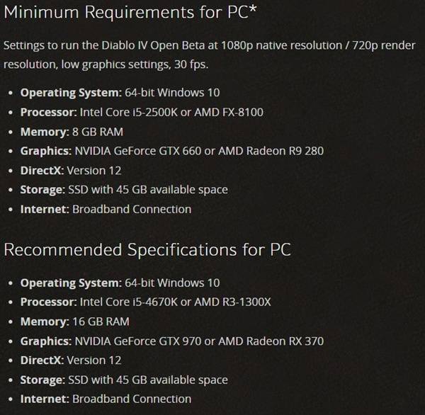 《暗黑破坏神 IV》公测版最低需要英伟达 GTX 660 或 AMD R9 280 显卡,且固态硬盘预留 45GB 可用空间。最小系统需求与推荐配置如下: