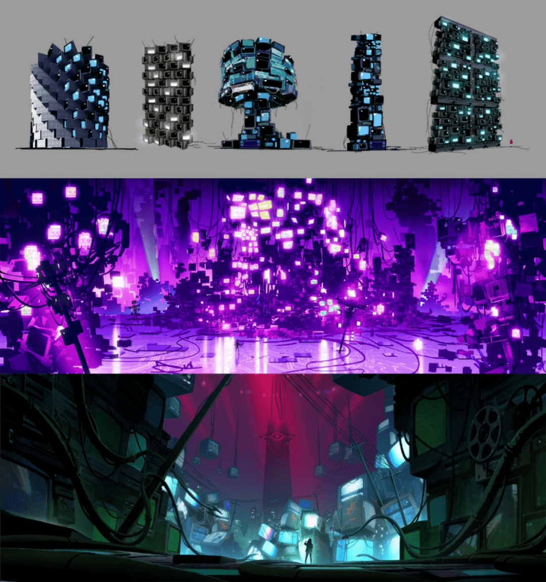 为了丰富视觉层次,场景设计成为了miHoYo Anime本片最下功夫的地方之一——团队设计了电器建筑的各种变体,还加入了大量霓虹灯和广告牌。团队还在特效软件Houdini里开发了自己的程序化生成工具,可以根据建筑外形自动生成堆叠好的电器建筑。
