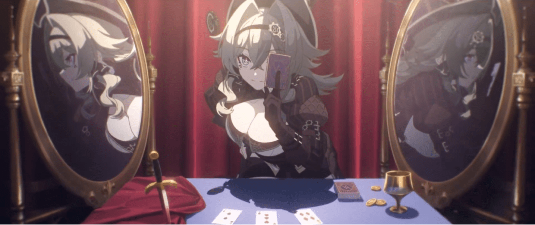 据了解,米哈游为片尾的每张插画都设计了海量的细节,例如桌上的牌面:“黑桃2,红心3,方片4分别指代凯文、阿波尼亚、伊甸,三个知晓爱莉希雅身份的人;梅花5则是她自己,她是唯一一个以一己之力看穿了真相的人。现在,她要放下这张牌,成为‘第四个’知道秘密的知情者”