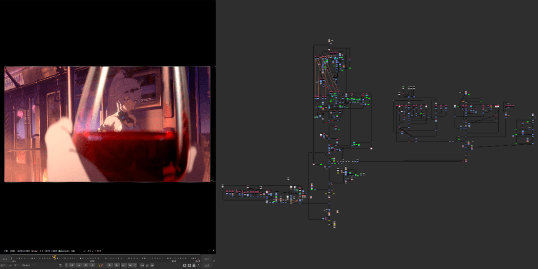 《毕业旅行》后期的Nuke工作界面截图:右边布满了密密麻麻的彩色方块,这还只是摄影合成使用所需要的节点