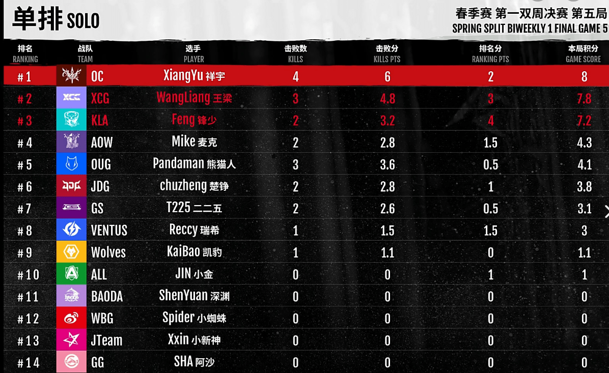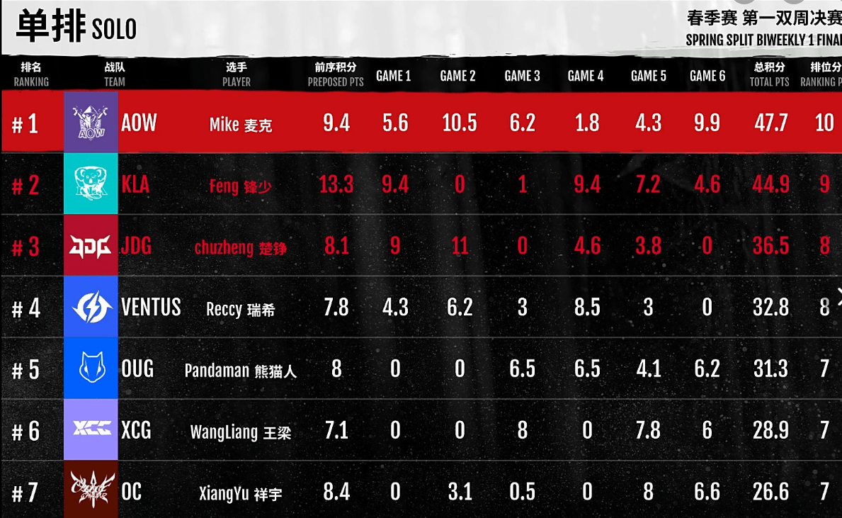 单排比赛一共有6局比赛,在这一日,Mike的整体分数和其他选手并没有拉开过大。总积47.7分更是跟第二名KLA.Feng(锋少)仅仅只差了1分,整场比赛,Mike也没有夺得天选之人,鏖战6局,对心态的压力是很大的。