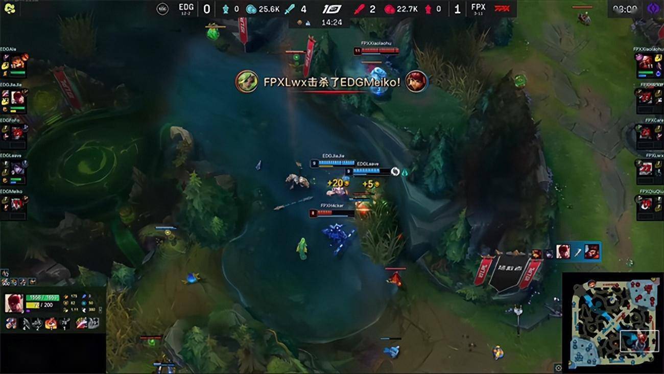 大树来到上路常规Gank,顺利击杀奎桑提拿到一血。双方发育了一段时间以后聚集在上路爆发团战,龙王赶到战场天瀑打出巨额伤害和控制,帮助FPX打出0换2。不久后双方在下路再次爆发团战打出1换1,FPX全员血量见底,泽丽趁机想要上前追击收割战局结果被奎桑提的无双陀斧击飞秒掉。FPX趁机发起反击带走EDG四人。虽然FPX连续几波团战获胜,但EDG通过控制小龙资源紧紧咬住经济没有被FPX拉开差距,依然在正面战场具有一战之力,FPX频繁发起先手想要扩大优势结果与EDG打成惨烈的3换3。23分钟小龙团战双方又一次在河道展开激战,EDG再次集中火力秒杀厄斐琉斯,而龙王在侧翼也带走了纳尔,双方再次打出2换2,但EDG已经拿下了听牌龙。