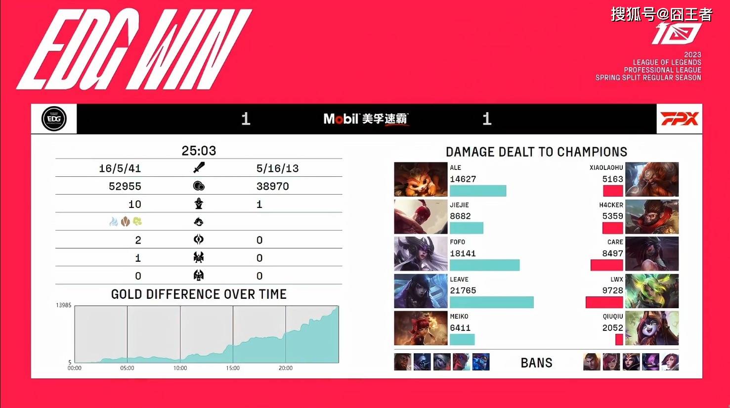 第一局比赛,两支世界冠军得主战队,打出了一场膀胱局。EDG除了在前10分钟打出了1K的优势之外,全程被FPX压制。而小凤凰则是自从16分钟左右,打出一波1换4团战后,就彻底掌控了场上的节奏,但无奈自身终结比赛的能力不强,一直被EDG顽强拖到大后期,最终才在40分钟左右堪堪击溃EDG的防守,赢下第一局!