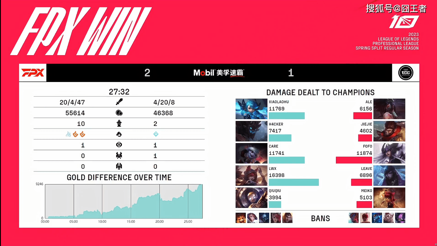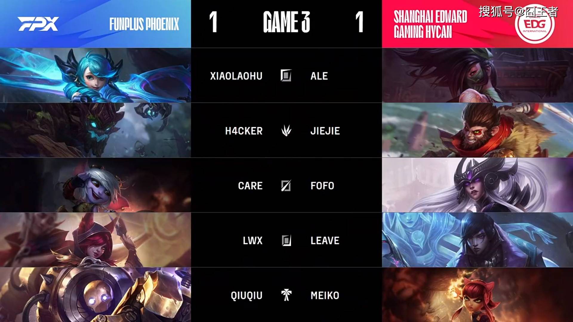 坦率地讲,决胜局的比赛,是囧王者在赛前没有想过的。颓势了快一整个常规赛的FPX,在彻底无缘季后赛之后,貌似打通了任督二脉,没有了压力之后,面对EDG打得有声有色。特别是球皇手感极其火热,开局就帮助FPX在下路连续三度击杀厄斐琉斯,随后又连续游走上路打开局面,FPX前期10分钟就打出近3K的经济优势。随后FPX貌似武魂觉醒,梦回S9,一路滚雪球,轻松在27分32秒,赢下整局比赛,算是爆了个大冷!