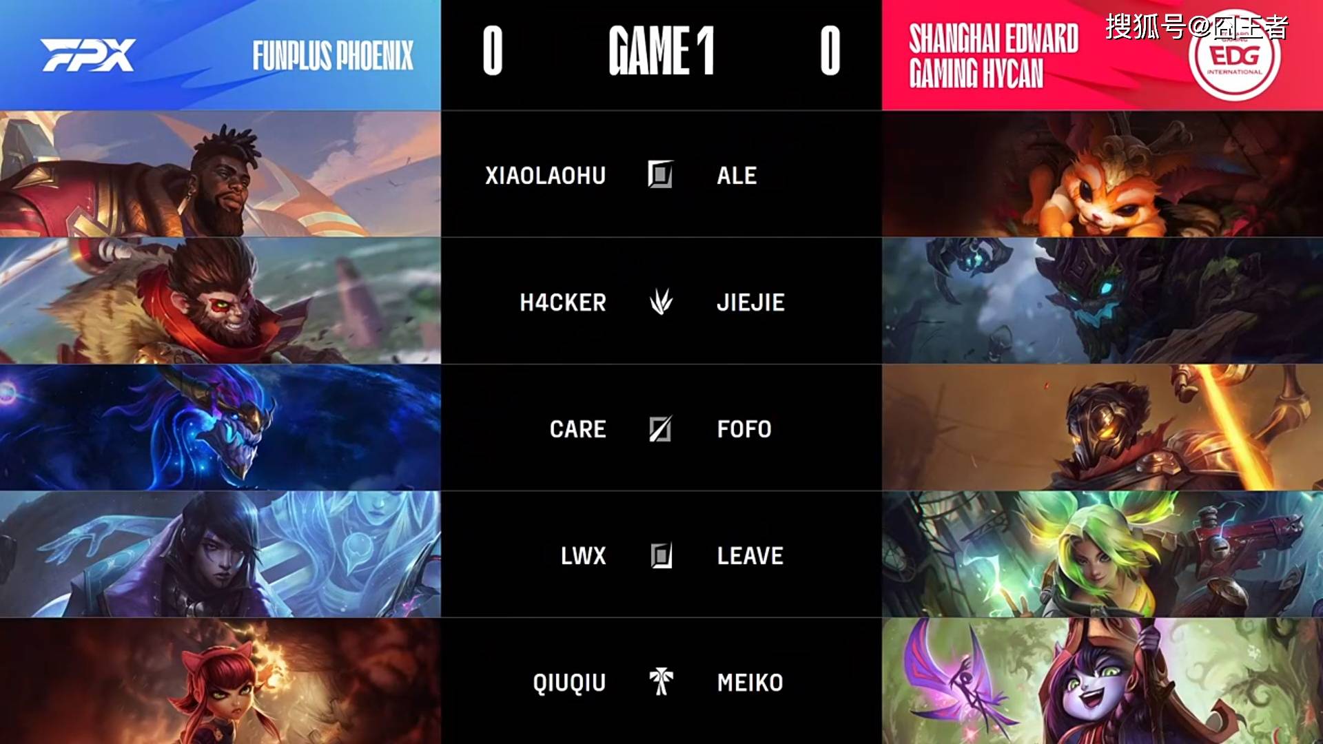 第一局比赛,FPX蓝色方,禁用杰斯,武器大师,蔚,剑姬,沙皇,选用奎桑提、猴子、龙王、厄斐琉斯、安妮;EDG红色方,禁用永恩,小炮,盲僧,泰坦,辛德拉,选用纳尔、大树、维克托、泽丽、璐璐。