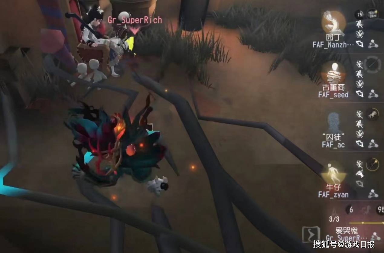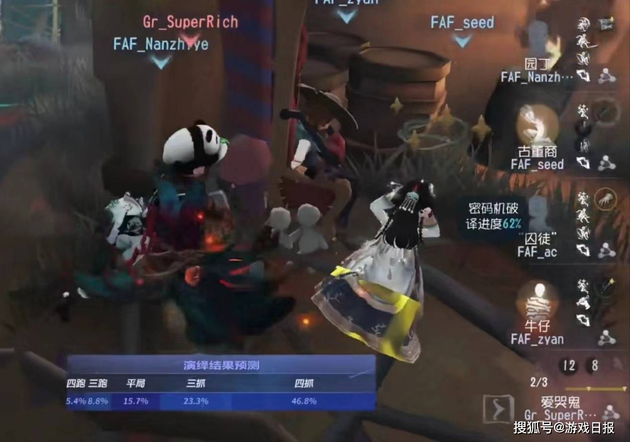 此时,双人倒地,园丁选择拆椅,只剩“囚徒”一人场外破译密码机。爱哭鬼选择修好椅子就近将倒地的古董商挂上。牛仔交出自愈离开,园丁只能硬着头皮试图卡半救下古董商。然而爱哭鬼走位逼迫,园丁在高压下极限卡半被打出震慑,爱哭鬼优势空前。