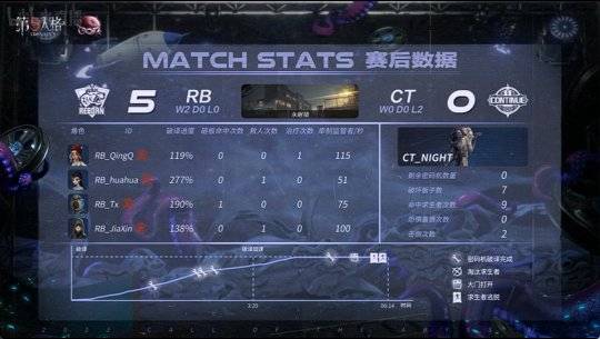 最终,RB以2胜0平0负(13:4)的比分击败CT,获得本场比赛的胜利。