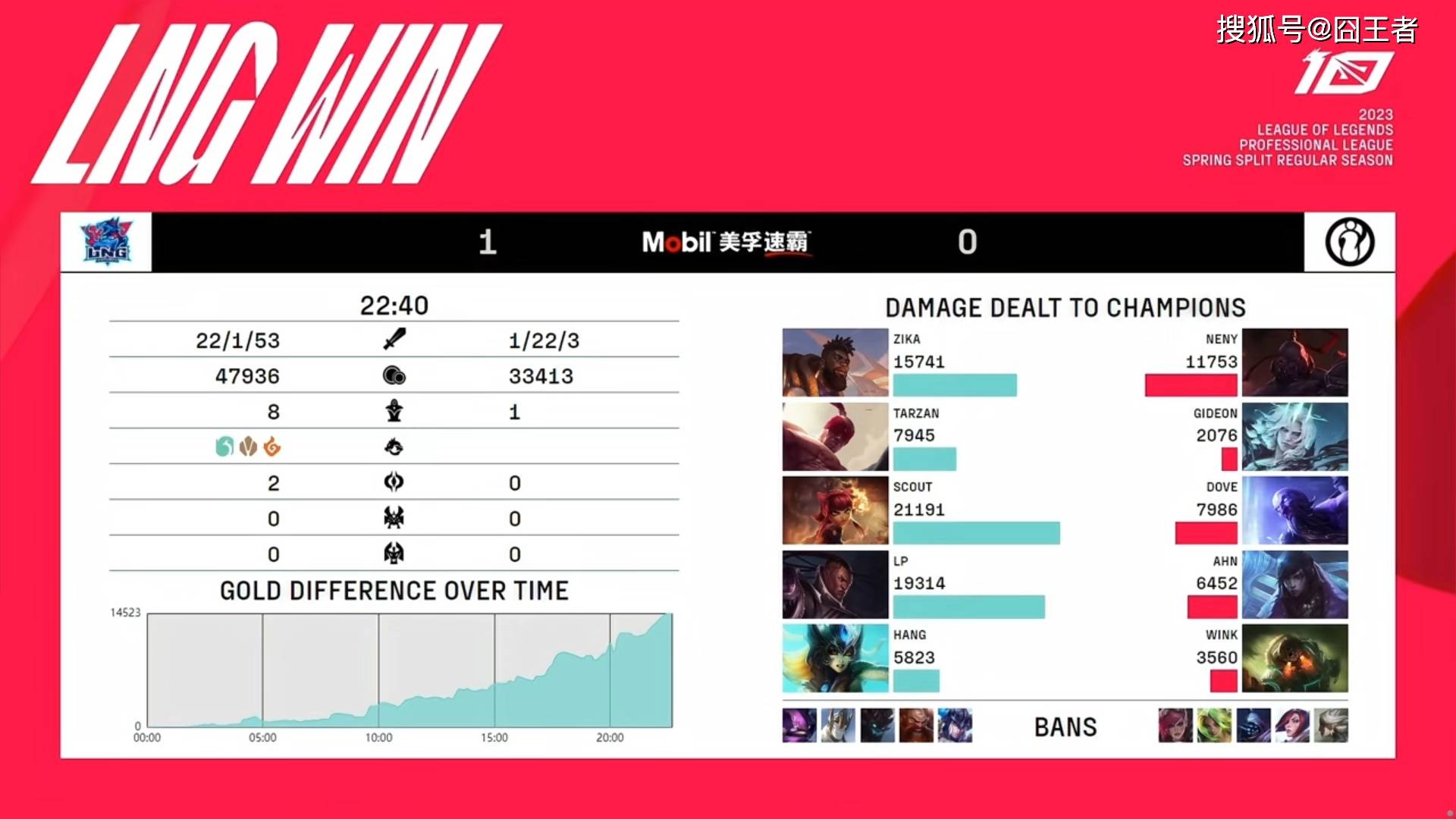 也许是听到EDG失败的消息,让LNG充满干劲,他们在第一局比赛中重拳出击,没有给予iG任何机会。而反观iG,则是在拿到一座防御塔之后,就在22分40秒内,匆匆投子认负。这种25分钟不到的速胜局,囧王者认为没有复盘的必要!
