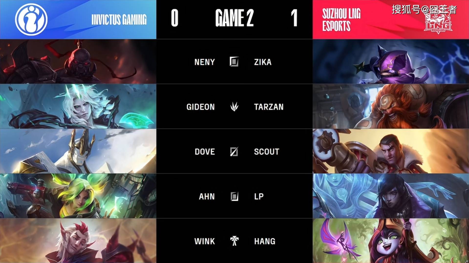 第二局比赛,IG蓝色方,禁用盲僧,蔚,楚雨荨妹,泰坦,锤石,选用赛恩、破败之王、加里奥、泽丽、洛;LNG红色方,禁用卢锡安,大树,猴子,辛德拉,安妮,选用凯南、酒桶、酒桶、厄斐琉斯、璐璐