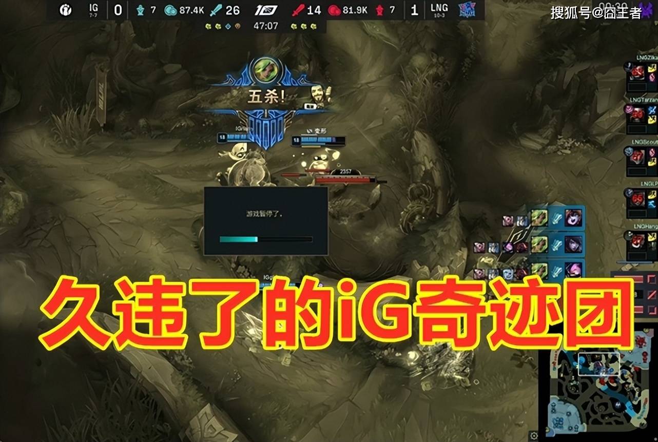 随后甚至IG在刚刚拿到五杀后,就遭遇比赛暂停。iG粉丝害怕会进行时空回溯,不过好在LNG并没有选择时空回溯。最终47分35秒,iG再次团灭LNG后,扳回一城,双方进入决胜局的比赛!对此网络上玩家笑谈:LNG是懂人情世故的!