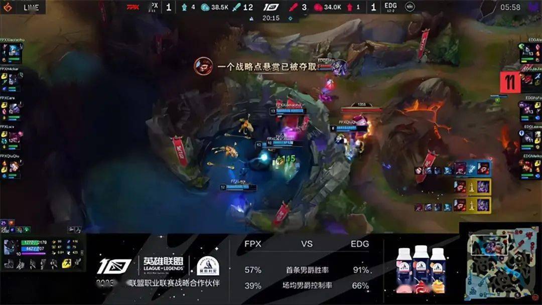 15分钟左右EDG野辅在河道争夺视野遭遇FPX的包夹,安妮和支援到场的阿卡丽先后遭到击杀,与此同时小炮TP绕后回旋推秒掉了厄斐琉斯,FPX瞬间打出0换3再度将优势扩大。20分钟刚到FPX自信满满直接开打大龙,EDG察觉情况以后猴子马不停蹄拼死冲进龙坑,硬生生在FPX的人群里抢到了大龙,为队伍争取到了宝贵的资源。FPX恼羞成功击杀辛德拉与猴子以后转身拿下己方第二条小龙。EDG暂时缓解了资源压力,但正面劣势依然很大,FPX有条不紊展开推进,继续通过野辅的先手创造机会,连续破掉三路外塔以后在上路二塔先手秒掉辛德拉,阿卡丽尝试单打被直接控死,FPX顺势推掉中路高地。