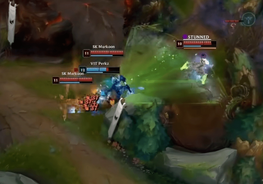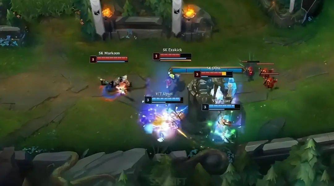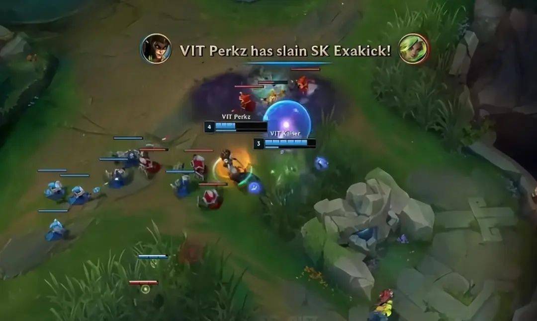 两人的处理毫无疑问是非常正确的,双方加起来五个人在塔下交战的同时,Perkz的蛇女也及时回到塔下TP支援,随后击杀了SK的泽丽。 一波越塔最终VIT这边打成了一换二,上路Bo又配合武器完成了对纳尔的越塔强杀,前期节奏一下子就好起来了。