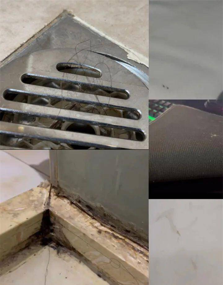 正当记者觉得可以在床上休息一会时,问题却在掀开被子的那一刻出现了。记者发现,黑色、黄色的污渍在白色床单上十分明显,拿起枕头还能看到没有清理干净的头发。走进卫生间,记者发现,地漏上也有残留的毛发。