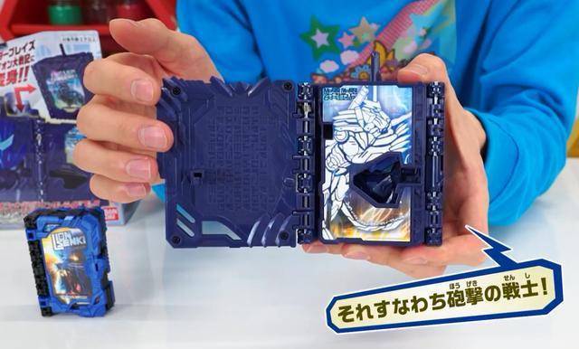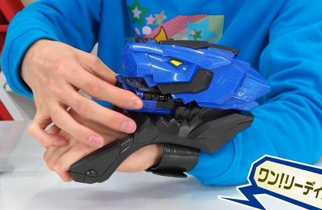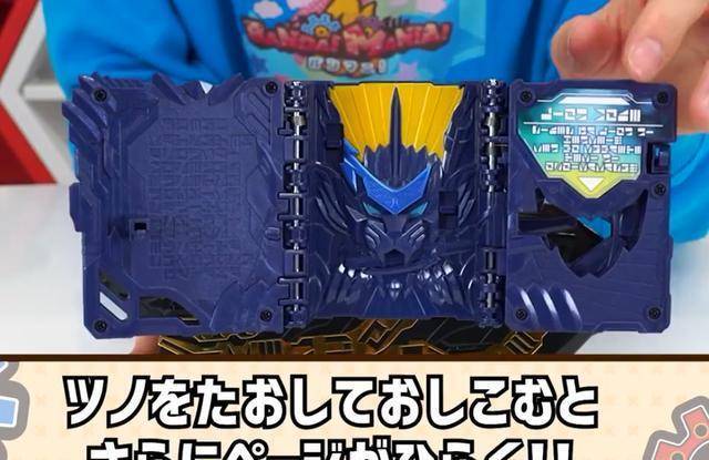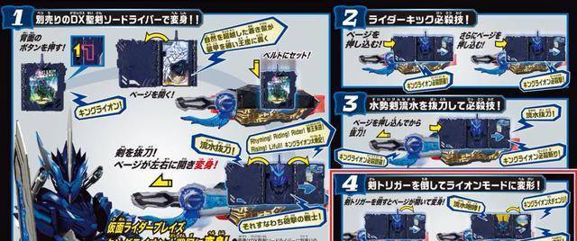 本款神骑书展开后和假面骑士beast也就是法爷中的二骑兽爷的腰带变身方式是一样的,两面同时展开,露出假面骑士剑锋的形象(兽爷:谢谢有被冒犯到)其神骑书额外附带突出的这个摇杆,可以向左侧掰动,这样会把剑锋骑士形态的书页翻到左侧,露出变形后的狮子形象。