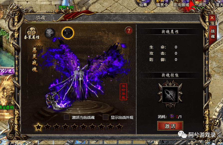 恶灵战魂激活后,都是0阶0星的,大家可消耗战魂精元的材料,来提升该战魂的等级,获得更高的属性。恶灵战魂还自带【恶灵缠绕】的技能效果,该效果可在攻击时,有概率触发,使目标造成伤害,降低相应比例,持续数秒。