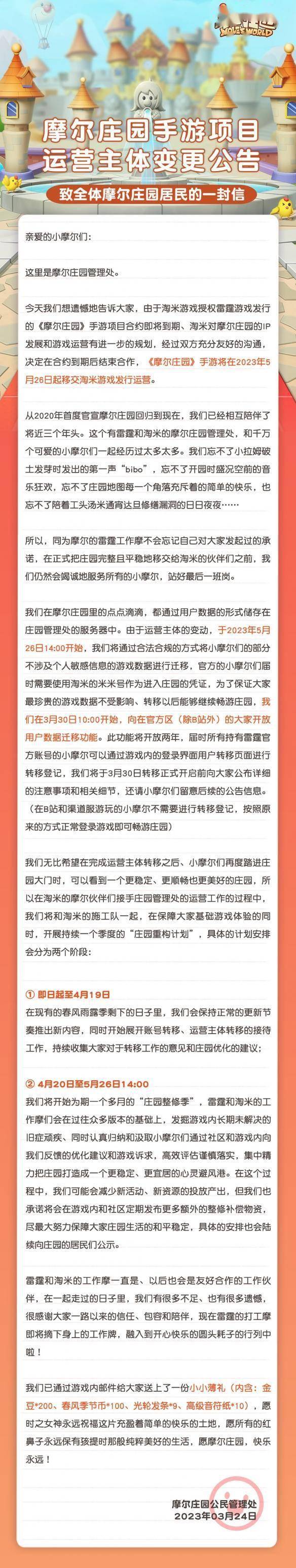 由于淘米游戏授权雷霆游戏的《摩尔庄园》手游项目合约即将到期、淘米对摩尔庄园的IP发展和游戏运营有进一步的规划,经过双方沟通决定在合约到期后结束合作,《摩尔庄园》手游将在2023年5月26日起移交淘米游戏发行运营。