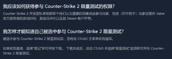 针对“CSGO2内测资格怎么获得”这一问题,官方已经给出了详细的解答,小编为大家找来了相关内容,入如下图所示,总结为部分玩家可以获得参加测试的资格,并且邀请的玩家数量会逐步增多。