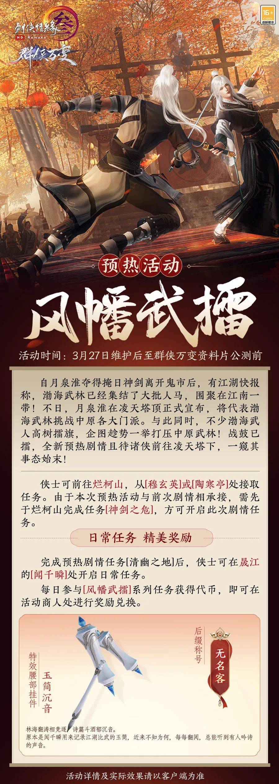 全新资料片预热剧情活动3月27日上线,参与并完成其日常任务还将有机会获得特效腰部挂件【玉简沉音】和专属称号【无名客】,精美奖励不容错过!