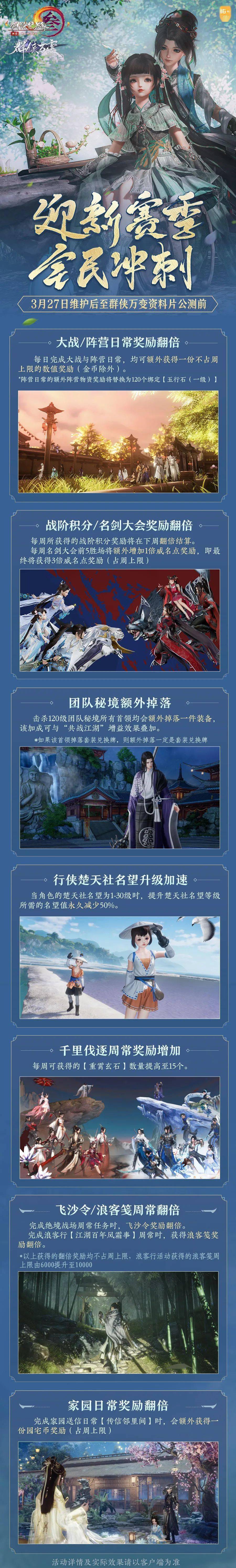 全门派首轮武学调整亦将于3月27日19:00开播,欢迎侠士们准时锁定三大平台,群侠同书新篇章,启航共赴新征程!