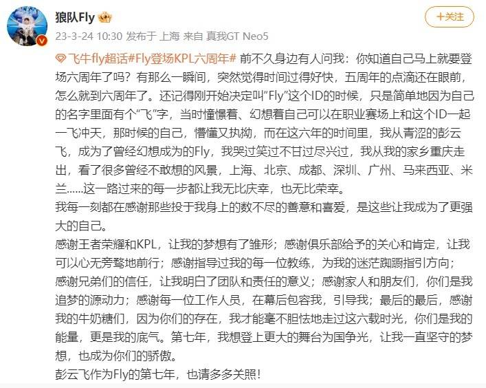 3月24日讯 今天是王者荣耀职业选手Fly在KPL登场六周年纪念日,Fly更新微博发布长文,原文如下: