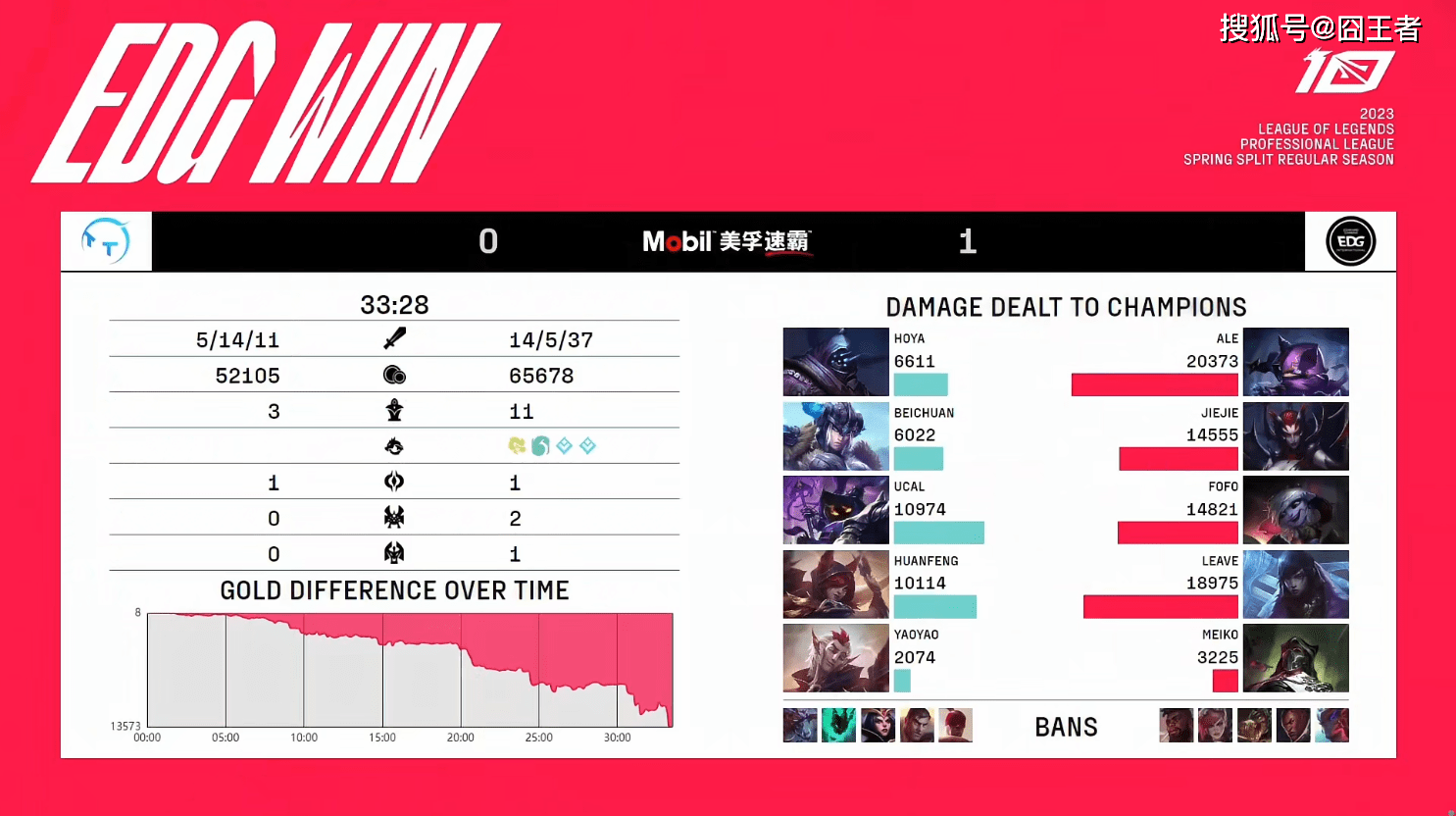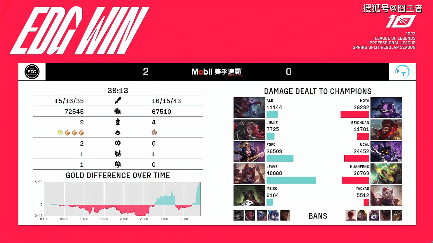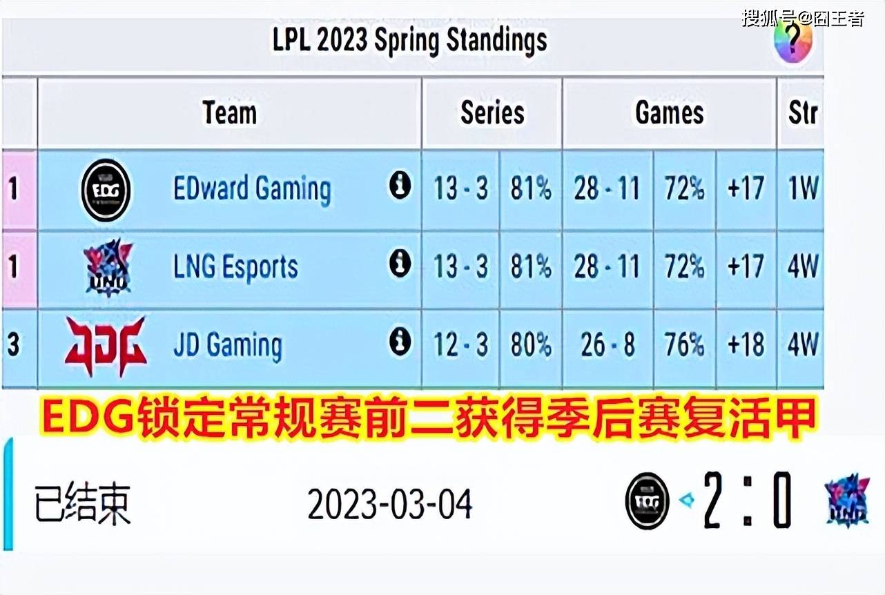 EDG以二比零的比分,横扫了TT之后。凭借这场胜利,EDG在常规赛中取得13胜3负的战绩。最终大场胜率以及小分和LNG持平,但是EDG凭借胜负关系的原因,直接锁定了常规赛前二的名次。也就是说,EDG由此获得一件季后赛复活甲,在后续的双败制季后赛中,占尽先机!下面压力给到了JDG,就看他们的表现了!