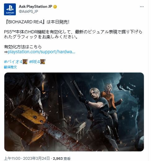 《生化危机4重制版》已经于今日正式发售,PS日本官方提醒玩家,本作PS5版支持HDR功能,玩家们游玩时不要忘记开启。