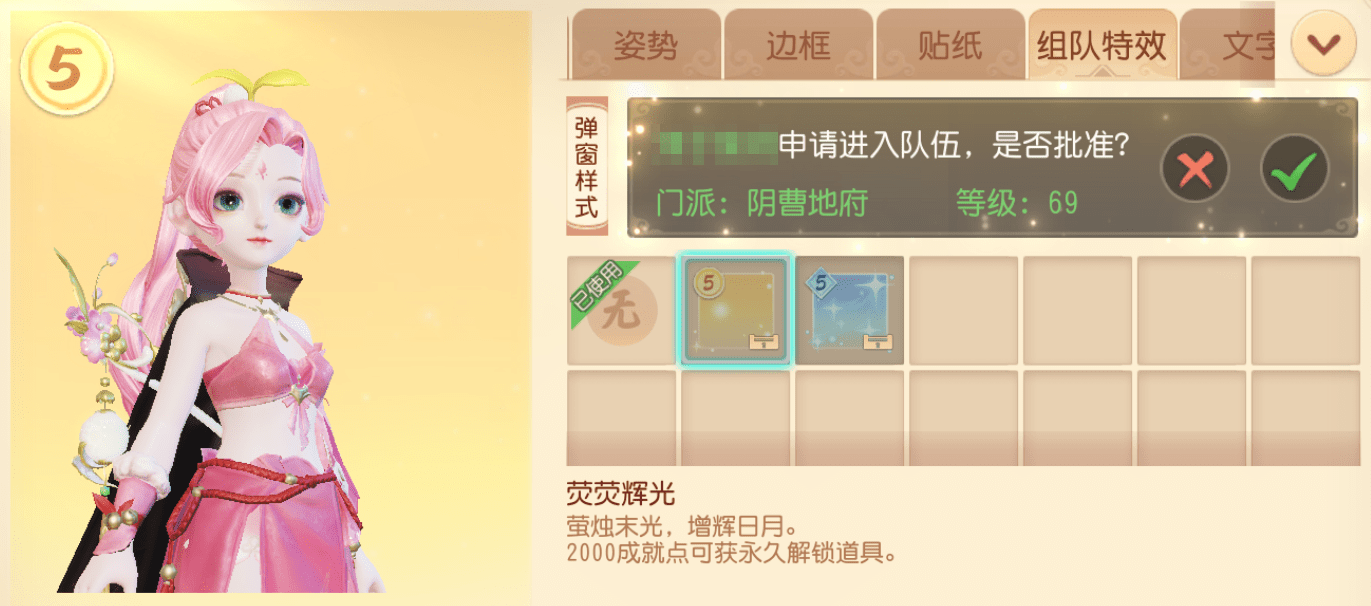 在活动界面中,少侠根据自己的成就点数领取对应奖励。总成就点至2000可免费解锁永久组队特效【荧荧辉光】,透明质感装点,四周荧光流转,这个组队特效走的是梦幻风呀!