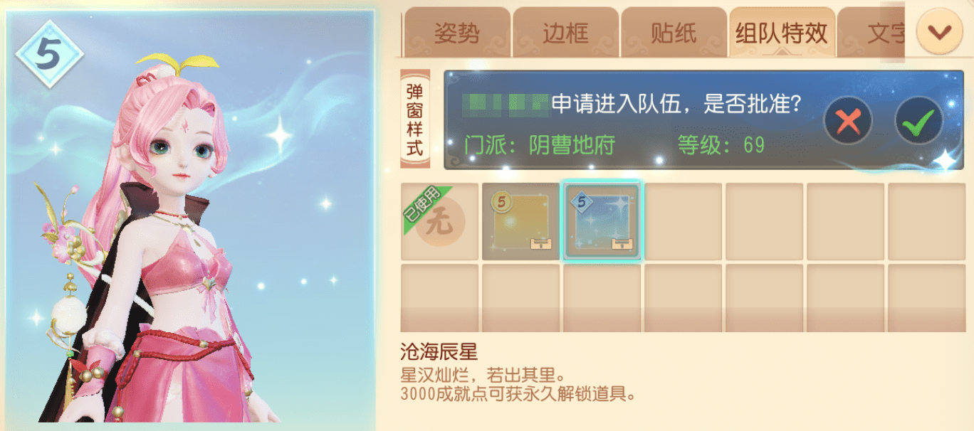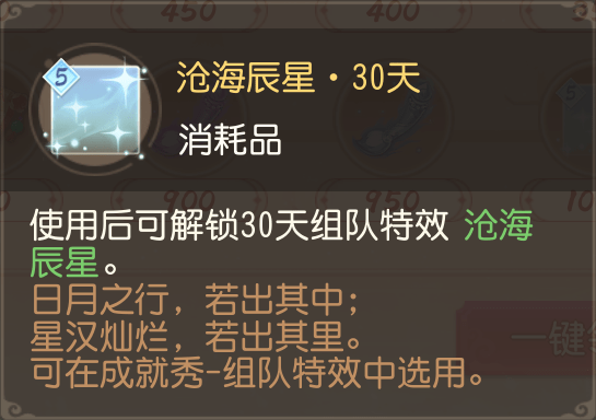 总成就点达3000可得永久组队特效【沧海辰星】,星汉灿烂,若出其里,点点繁星,落下荧光,仿佛置身银河之中!换上这个组队特效感觉申请入队都更有面子了!