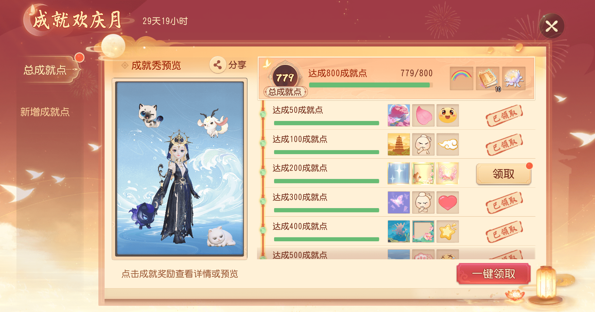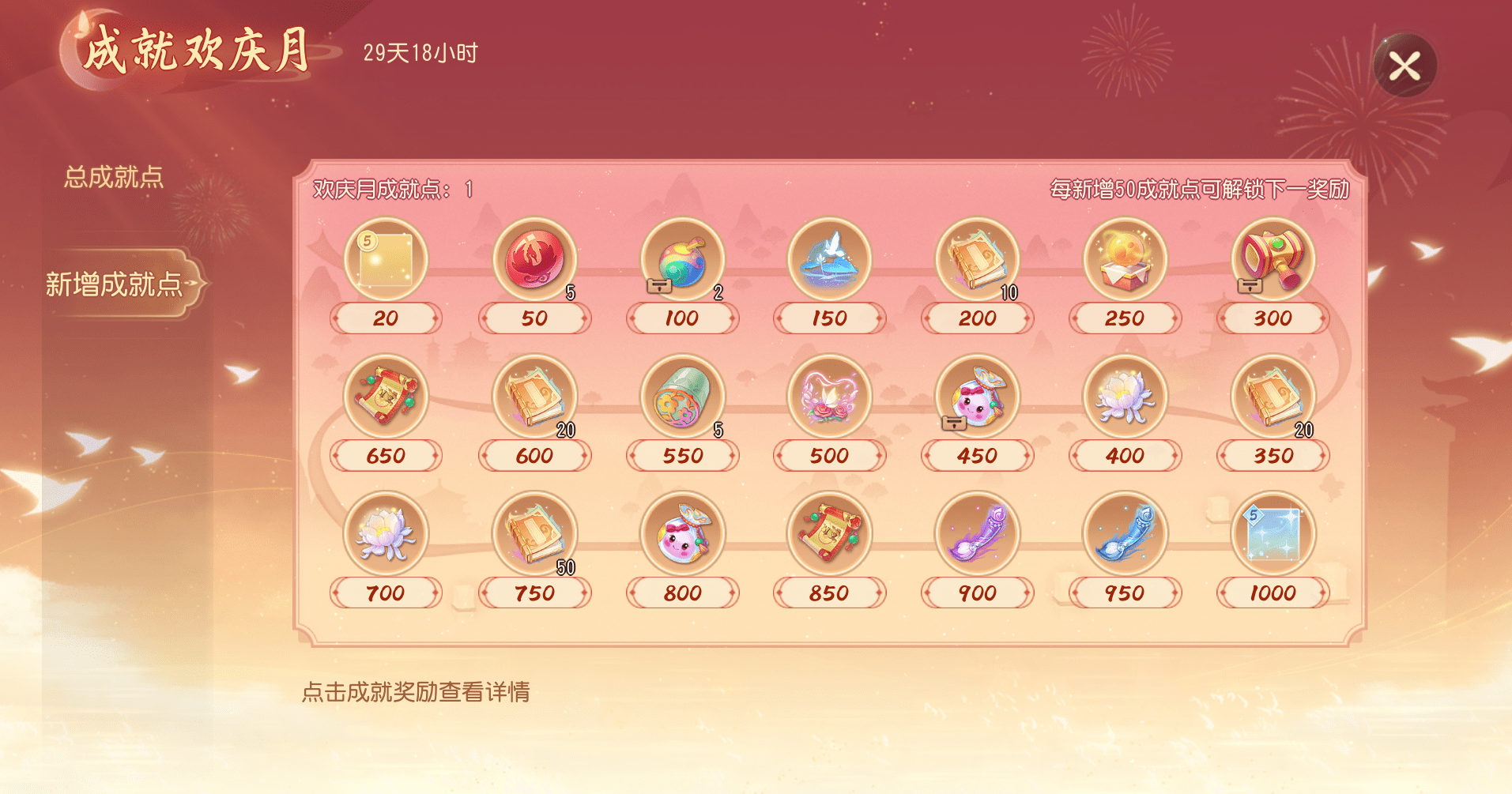 相比起老玩家,新手玩家刚入坑不久,解锁的成就没有那么多,但可以通过新增成就点来领取奖励。在活动期间,每新增50成就点少侠就可领取对应奖励,新增点数达到1000即可解锁所有奖励。