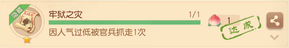 因人气过低被官兵抓走一次,即可解锁成就【牢狱之灾】。