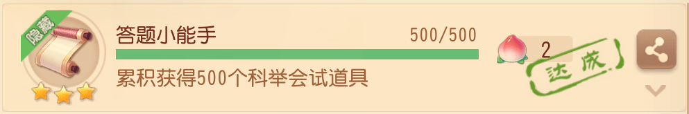 每周日13:00-17:00少侠可在必做活动中,参与科举会试,累积获得500个科举会试道具即可解锁成就【答题小能手】。