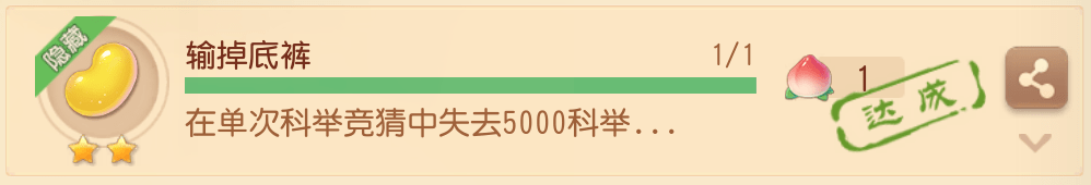 少侠可参与【科举竞猜】,单次玩法中失去5000科举豆即可解锁成就【输掉底裤】。