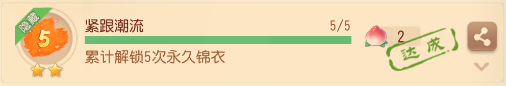 累计解锁5次永久锦衣,即可解锁隐藏成就【紧跟潮流】。