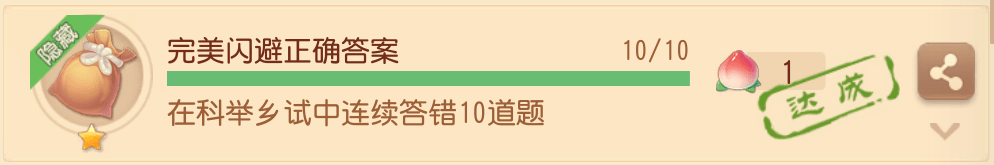 少侠在科举乡试中,连续答错10题即可解锁成就【完美闪避正确答案】。