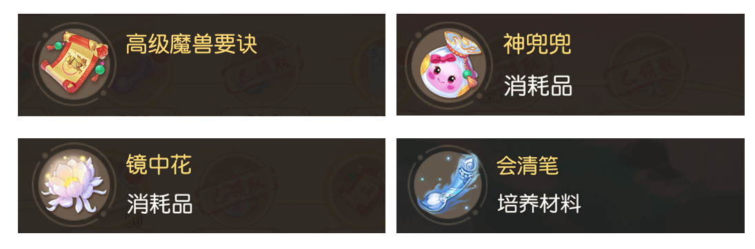 除此之外,还有【高级魔兽要诀】、【神兜兜】、【镜中花】、【会清笔】等常用高价值道具可以领取!这次成就月活动奖励如此丰富,真的是十分良心了!