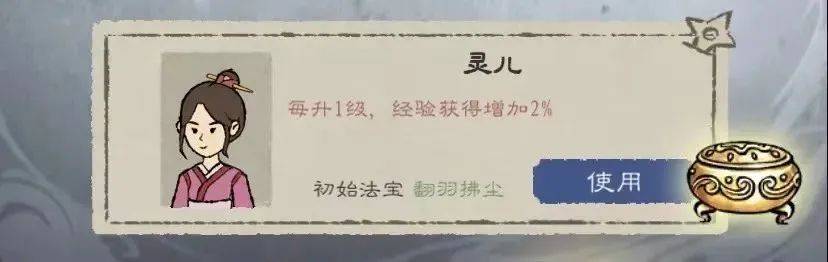 灵儿的推荐理由就是升级有经验加成(比其他角色升级快),初始法宝翻羽拂尘专打近距离目标也是极其适合新人,不论放风筝打法还是一动不动。