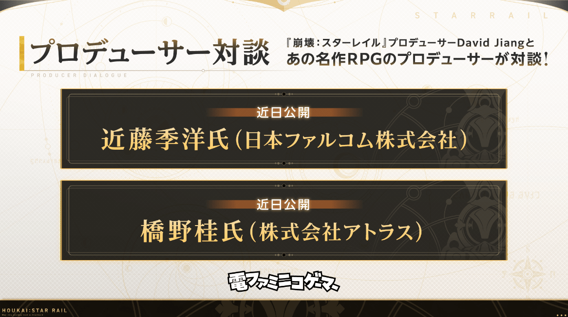 甚至在日区直播间中,米哈游还公布了与日本知名游戏媒体fami的“名作RPG制作人”的对谈活动,到时候不仅《崩坏:星穹铁道》的制作人David Jiang登场,同时还有打造了轨迹系列作品的日本Falcom社长近藤季洋,以及P5系列的制作人桥野桂到,看到这个阵容说不定未来《星穹铁道》还有可能与轨迹和P5联动呢,毕竟大家都是圈内知名的RPG游戏,合作双赢也不是不可能的事情。