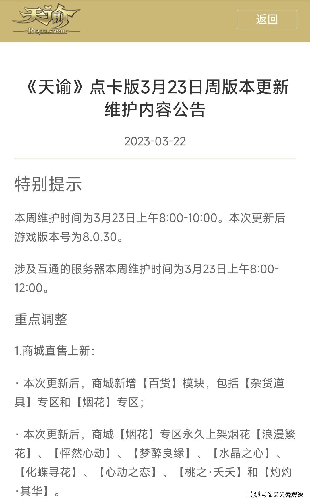 接下来是天谕点卡版3月23日周版本更新维护公告。