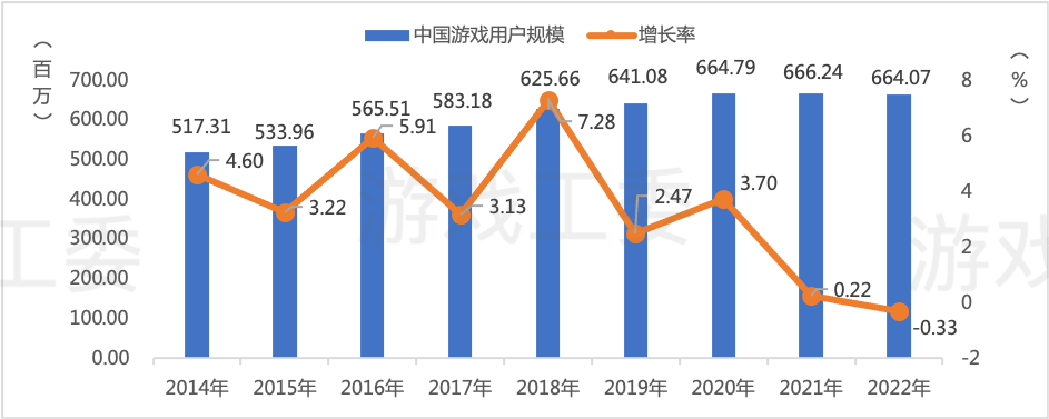 与此同时,中国游戏用户规模也遭遇了近十年来的首次下降。2022年,中国游戏用户规模为6.64亿人,同比下降0.33%。业界预警许久的“游戏人口红利见顶”终于成为现实。