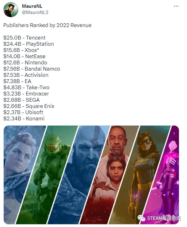 分析师“ MauroNL3”盘点了2022年全球游戏厂商的营收表现,其中腾讯以250亿美元的收入成功登顶。