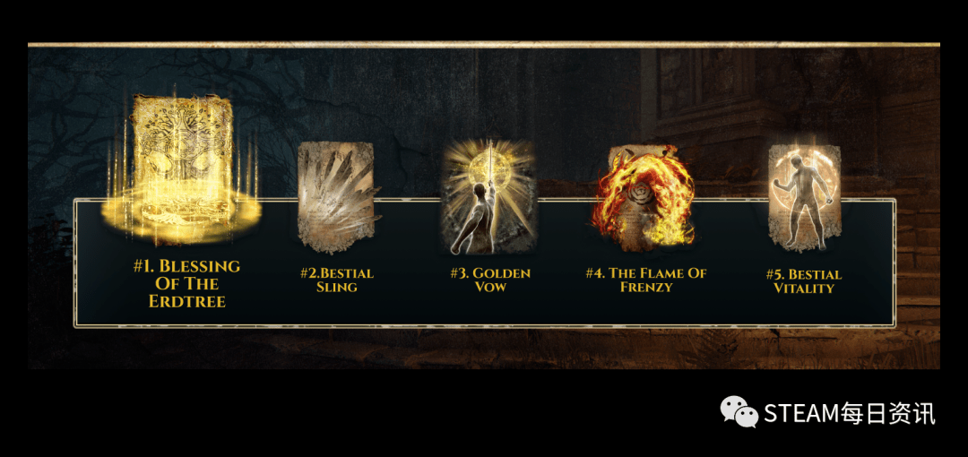 使用次数前五的祷告:黄金树恩惠、兽石、黄金树立誓、癫火、野兽活力。