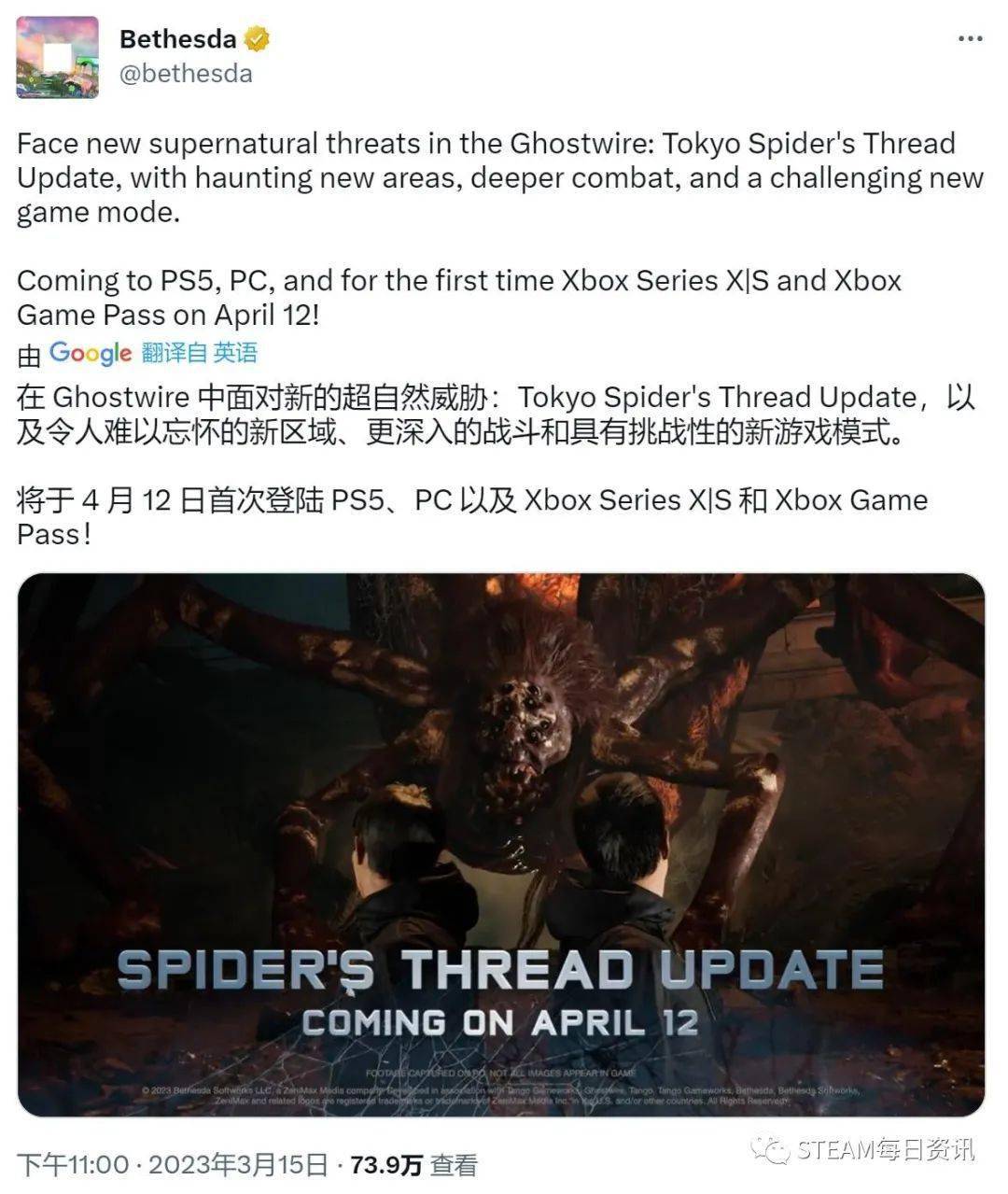 此外,B社日前官宣了《幽灵线:东京》将在4月12日登陆Xbox Series X|S平台,并将在同日加入XGP游戏库。游戏还将推出免费更新“Spider's Thread”,包含新的地图和任务,以及全新的roguelike游戏模式。