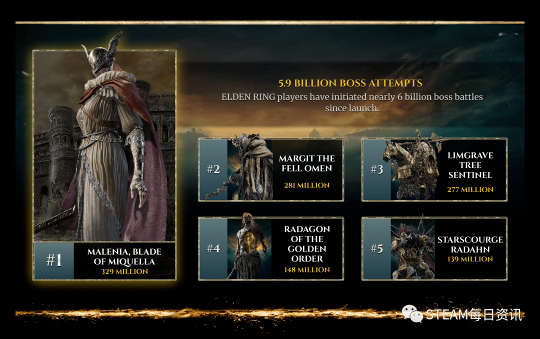 为庆祝《艾尔登法环》发售一周年,万代南梦宫在游戏官网发布了一组玩家趣味数据,介绍了玩家们挑战BOSS次数、死亡原因和玩法等。具体如下: