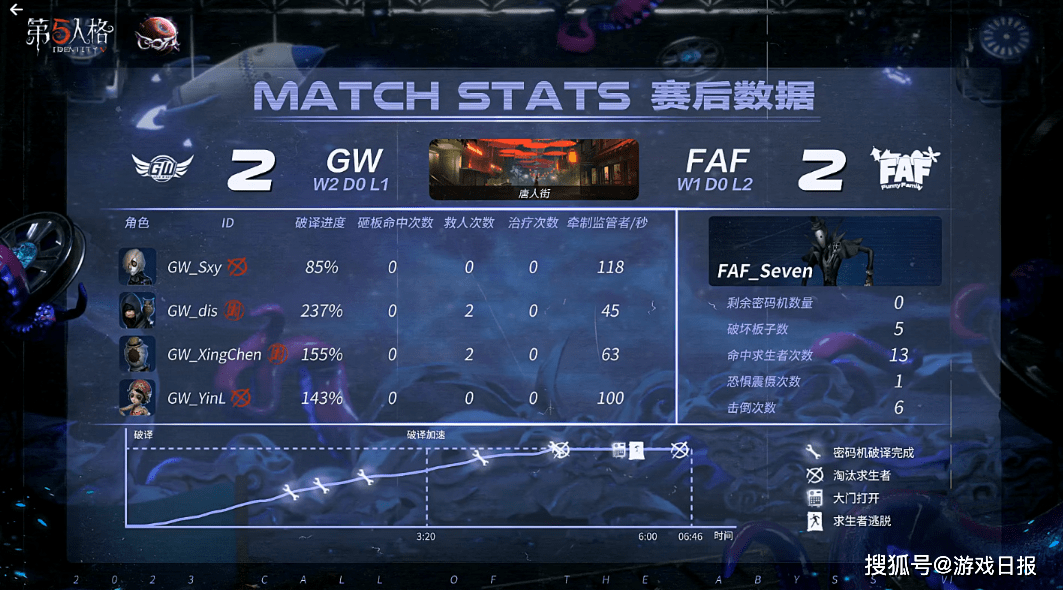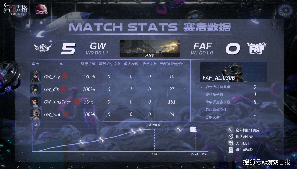 值得一提的是,虽然FAF被淘汰,但他们精彩的表现却给大家留下了深刻记忆。面对GW战队的第一局比赛,上半局FAF求生者勘探员共牵制监管者122秒,再加上队友先知的利用音乐盒在一旁的协助,最终上半局比赛FAF完成三跑,取得开门红。