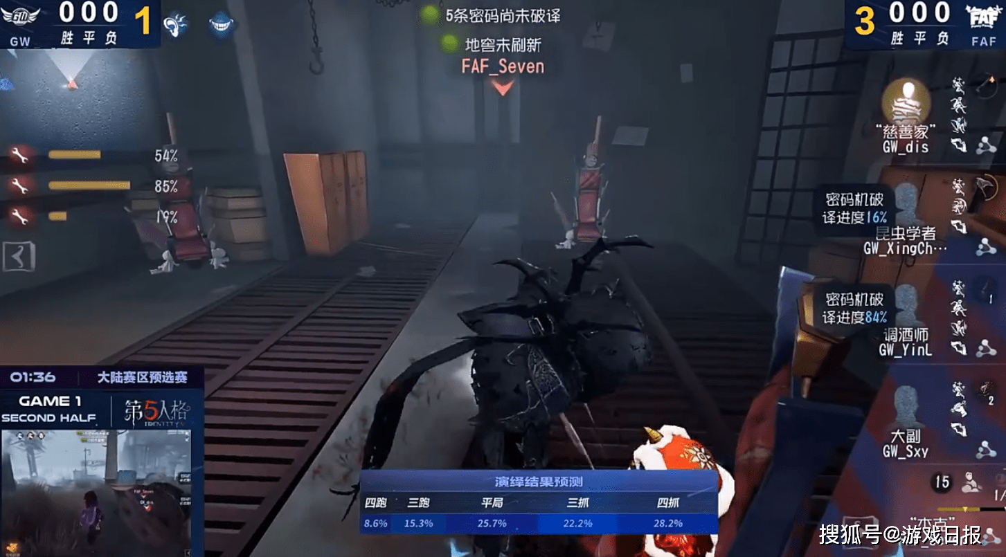 最终决胜局,GW找到节奏,上半场比赛中GW掏出蜘蛛监管者,开局首追对方勘探员,将其双倒,最后击倒对方求生者舞女拿下三抓,基本奠定胜局。决胜局下半场,面对对方此前发挥良好的绝活监管者“杰克”,GW这次顶住压力完成保平,以总比分领先的优势拿下最终比赛。