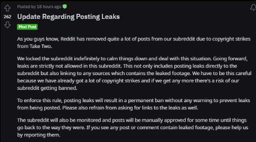 距离上次泄露之后,有关《GTA6》的小规模爆料时有发生,Take-Two也开始准备新的应对策略。今日,据外媒gamerant消息,Reddit论坛《GTA6》版块早些时间发布公告:由于Take-Two的版权打击,Reddit现已删除大量帖子未来也将严禁发布泄露内容。