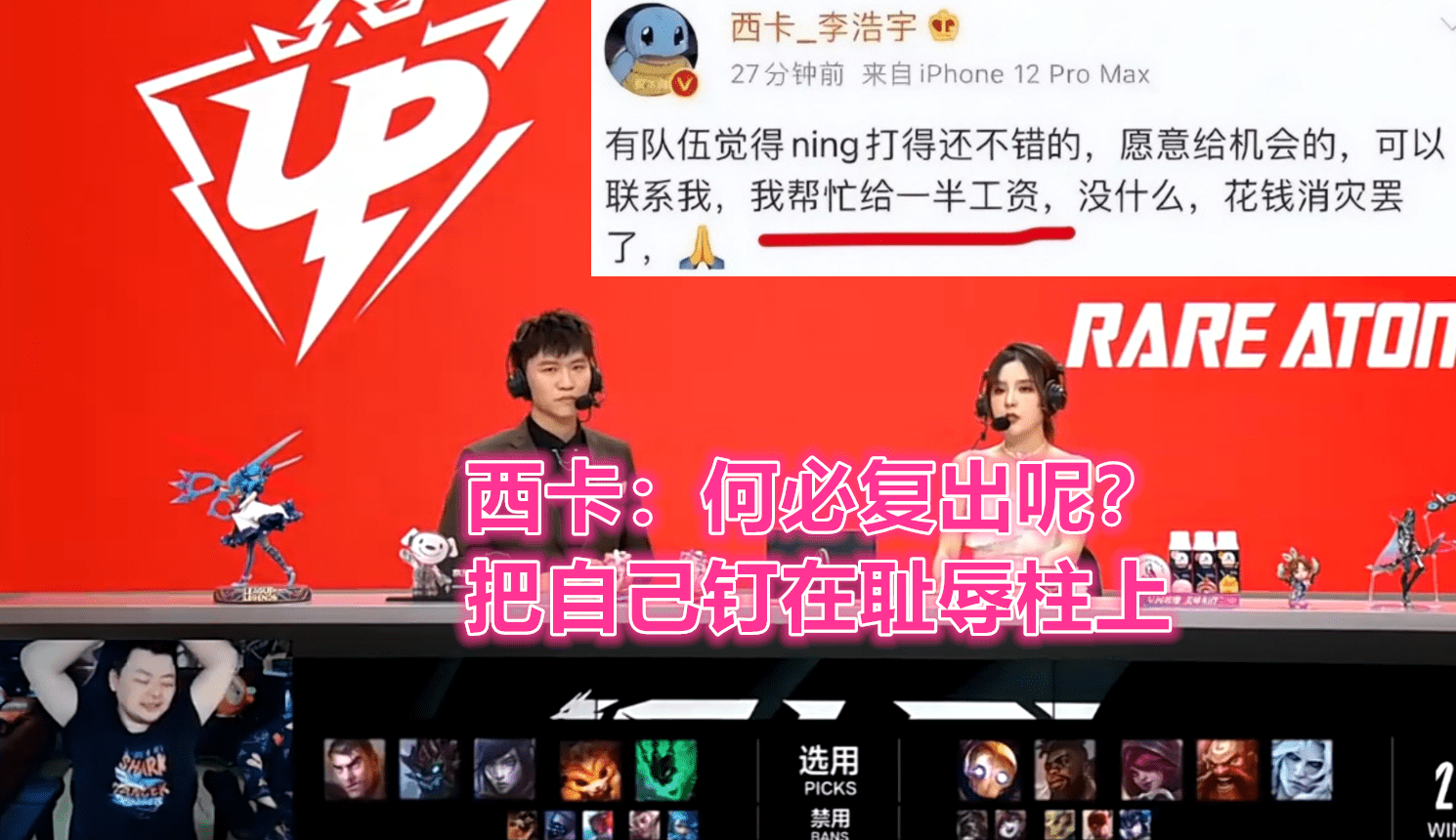 当初宁王开团DYS,指责笑笑西卡侮辱职业选手,但他自己也没好到哪去。那时西卡还说宁王复出就替俱乐部出一半工资,但他后来食言装死了。只是电子竞技成王败寇,如今宁王沦成笑话被狂踩,西卡都笑歪嘴了,在直播时嘲笑道:“何必复出呢?把自己钉在耻辱柱上!”