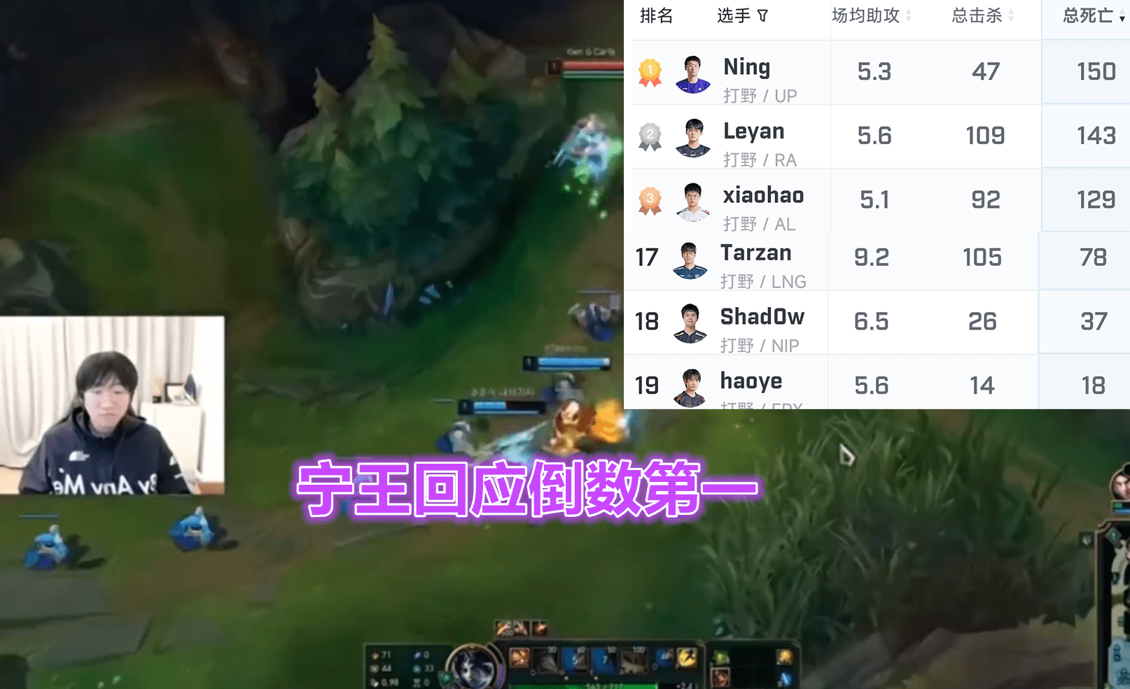 S8冠军野辅复出沦为笑话,感觉宝蓝就不像个职业选手,各种迷路逛街送人头,身为辅助居然能被单杀12次。只要宝蓝敢开团,不管是不是在白给,宁王绝对会跟他一起冲,经常造成野辅联动一死一送的局面。LPL联赛只有17支队伍,宁王的死亡数却排到第十九名,输出数据也是垫底,当年的FMVP已经回不去了。